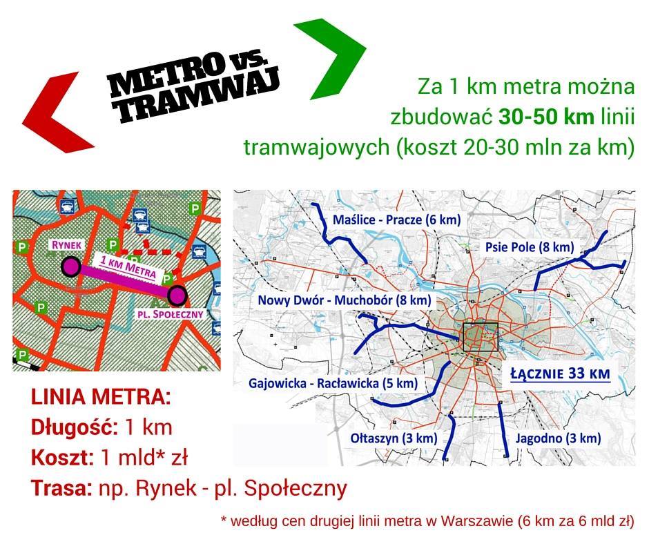 Budowa metra wymaga wykopów w centrum i spowoduje utrudnienia dla mieszkańców (w Berlinie budowa linii U-5 ma potrwać 11 lat). System tramwajowy i kolejowy już istnieją, trzeba je rozwijać w miejscach, gdzie ich nie ma. Metro o długości kilku kilometrów obsłuży tylko jedną dzielnicę. Sieć tramwajową i kolejową za tę cenę można rozbudować na wiele osiedli.